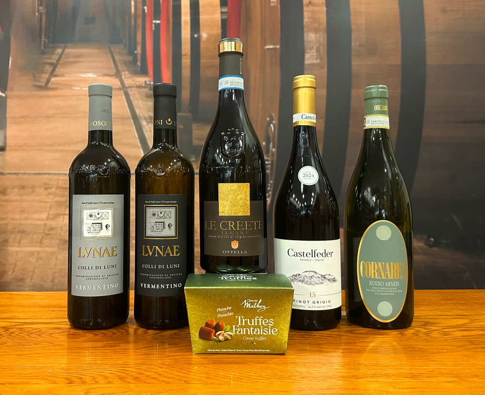 Hea valik meie parimatest Itaalia valgetest veinidest, mis toovad esile Põhja - Itaalia värskuse ja Liguuria vahemerelise iseloomu + kingituseks kvaliteetsed Prantsuse pistaatsia trühvlid. Colli di Luni Et. Nera Vermentino, Liguuria; Colli di Luni Et. Grigio Vermentino, Liguuria; Cornarea Roero Arneis Piemonte; Ottella Le Creete, Lugana; Castelfeder Raif Alto Adige; Chocolat Mathez pistaatsia trühvlid 100g