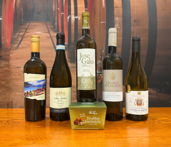 Mõistliku hinnaga valgete veinide valik, mis pakub head kvaliteeti ja maitset ja kingituseks kvaliteetsed Prantsuse šokolaaditrühvlid. Jose Galo Verdejo Rueda; Biscardo Custoza Veneto; Biscardo Soave Veneto; Cellier Sceau Blanc Cotes du Rhone; Quinta D`Amares Loureiro Alvarino; Chocolat Mathez pistaatsia trühvlid 100g