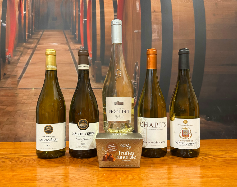 Stiilsed ja elegantsed Prantsuse valged + kingituseks kvaliteetsed Marc de Champagne trühvlid. Pigoudet Blanc Classic, Provence; Terres Secretes Macon Jarrier, Burgundia: Les Preludes Saint Veran, Burgundia; Cellier Sceau blanc Cotes dui Rhone, Chablis Tremblay Marchive; Chocolat Mathez Marc de Champagne trühvlid 100g